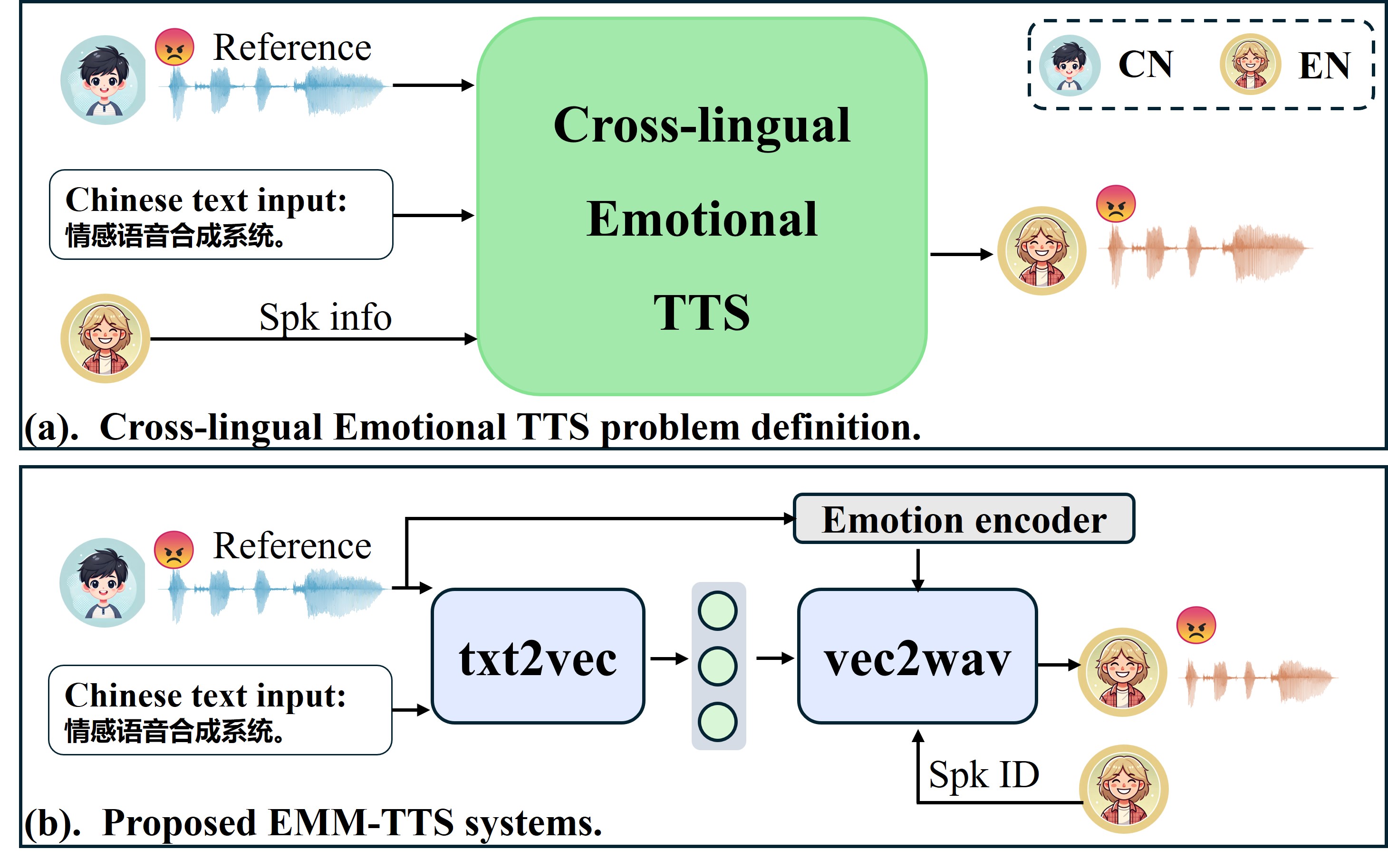 Cross-lingual Emotion TTS Authors: Cheng Gong, Chunyu Qiang, Tianrui Wang, Yu Jiang, Yuheng Lu, Ruihaojing, Xiaoxiao Miao, Xiaolei Zhang, Longbiao Wang, Jianwu Dang ▶ College of Intelligence and Computing, Tianjin University, China ▶ Institute of Artificial Intelligence (TeleAI), China Telecom ▶ Duke Kunshan University, China ▶ Shenzhen Institute of Advanced Technology, Chinese Academy of Sciences, Guangdong English speech result: Input Text: 是的真是名副其实。 Method (Intral-Lingual) Target CN Speaker Biaobei Your browser does not support the audio element. (Cross-Lingual) Target EN Speaker LJSpeech Your browser does not support the audio element. Neutral Angry Happy Sad Surprise Neutral Angry Happy Sad Surprise M3 Your browser does not support the audio element. Your browser does not support the audio element. Your browser does not support the audio element. Your browser does not support the audio element. Your browser does not support the audio element. Your browser does not support the audio element. Your browser does not support the audio element. Your browser does not support the audio element. Your browser does not support the audio element. Your browser does not support the audio element. DiCLET-TTS Your browser does not support the audio element. Your browser does not support the audio element. Your browser does not support the audio element. Your browser does not support the audio element. Your browser does not support the audio element. Your browser does not support the audio element. Your browser does not support the audio element. Your browser does not support the audio element. Your browser does not support the audio element. Your browser does not support the audio element. EMM-TTS Your browser does not support the audio element. Your browser does not support the audio element. Your browser does not support the audio element. Your browser does not support the audio element. Your browser does not support the audio element. Your browser does not support the audio element. Your browser does not support the audio element. Your browser does not support the audio element. Your browser does not support the audio element. Your browser does not support the audio element. Reference speech Your browser does not support the audio element. Your browser does not support the audio element. Your browser does not support the audio element. Your browser does not support the audio element. Your browser does not support the audio element. Chinese speech result: Input Text: What do you think of this question? Method (Cross-Lingual) Target CN Speaker Your browser does not support the audio element. (Intral-Lingual) Target EN Speaker Your browser does not support the audio element. Neutral Angry Happy Sad Surprise Neutral Angry Happy Sad Surprise M3 Your browser does not support the audio element. Your browser does not support the audio element. Your browser does not support the audio element. Your browser does not support the audio element. Your browser does not support the audio element. Your browser does not support the audio element. Your browser does not support the audio element. Your browser does not support the audio element. Your browser does not support the audio element. Your browser does not support the audio element. DiCLET-TTS Your browser does not support the audio element. Your browser does not support the audio element. Your browser does not support the audio element. Your browser does not support the audio element. Your browser does not support the audio element. Your browser does not support the audio element. Your browser does not support the audio element. Your browser does not support the audio element. Your browser does not support the audio element. Your browser does not support the audio element. EMM-TTS Your browser does not support the audio element. Your browser does not support the audio element. Your browser does not support the audio element. Your browser does not support the audio element. Your browser does not support the audio element. Your browser does not support the audio element. Your browser does not support the audio element. Your browser does not support the audio element. Your browser does not support the audio element. Your browser does not support the audio element. Reference speech Your browser does not support the audio element. Your browser does not support the audio element. Your browser does not support the audio element. Your browser does not support the audio element. Your browser does not support the audio element.